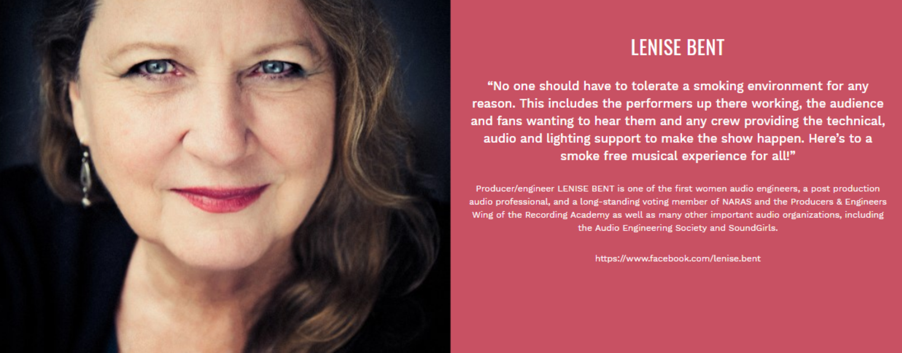 “No one should have to tolerate a smoking environment for any reason. This includes the performers up there working, the audience and fans wanting to hear them and any crew providing the technical, audio and lighting support to make the show happen. Here’s to a smoke free musical experience for all!”